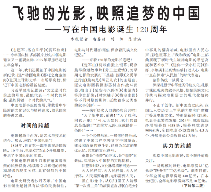 这一年,我们还见证了中国电影的新纪录:国产动画电影《哪吒之魔童闹海》登顶全球影史单一市场票房榜,标记下中国电影的最新刻度。(今日《人民日报》1版、2版)