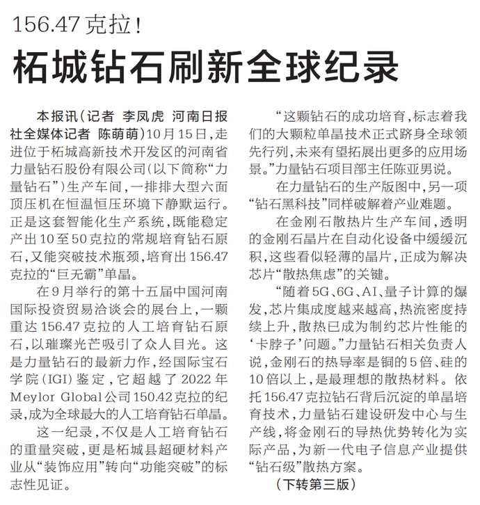10月15日,走进位于柘城高新技术开发区的河南省力量钻石股份有限公司(以下简称“力量钻石”)生产车间,一排排大型六面顶压机在恒温恒压环境下静默运行。正是这套智能化生产系统,既能稳定产出10至50克拉的常规培育钻石原石,又能突破技术瓶颈,培育出156.47克拉的“巨无霸”单晶。(今日《河南日报》1版)
