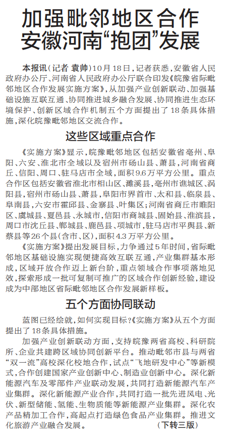 10月18日,记者获悉,安徽省人民政府办公厅、河南省人民政府办公厅联合印发《皖豫省际毗邻地区合作发展实施方案》,从加强产业创新联动、加强基础设施互联互通、协同推进城乡融合发展、协同推进生态环境保护、创新区域合作机制五个方面提出了18条具体措施,深化皖豫毗邻地区交流合作。(今日《郑州日报》1版、3版)