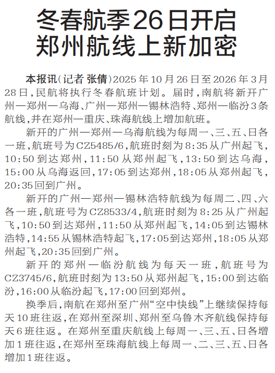 2025年10月26日至2026年3月28日,民航将执行冬春航班计划。届时,南航将新开广州—郑州—乌海、广州—郑州—锡林浩特、郑州—临汾3条航线,并在郑州—重庆、珠海航线上增加航班。(今日《郑州日报》1版)