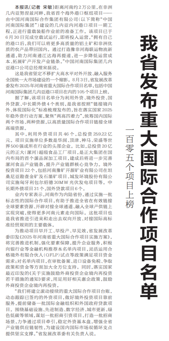 距离河南约2万公里,在非洲几内亚努涅兹河畔,我省首个海外港口枢纽项目——由中国河南国际合作集团有限公司(以下简称“中国河南国际集团”)建设的几内亚内河港口项目一期工程,正进行重载装船作业前的准备工作。(今日《河南日报》1版)