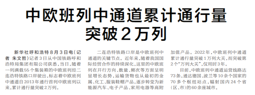 中欧班列中通道累计通行量突破2万列
