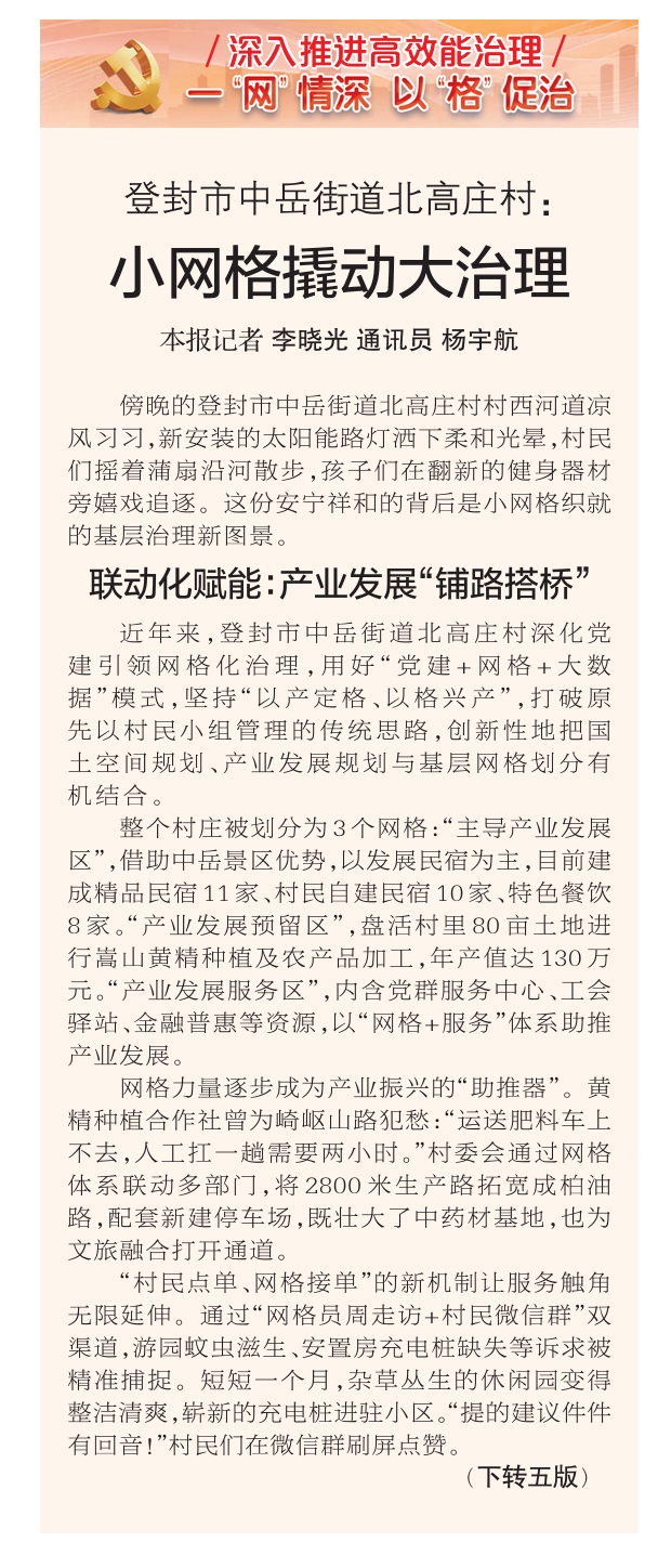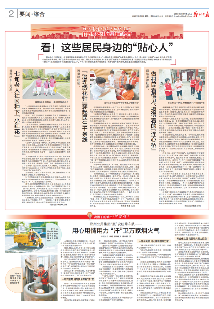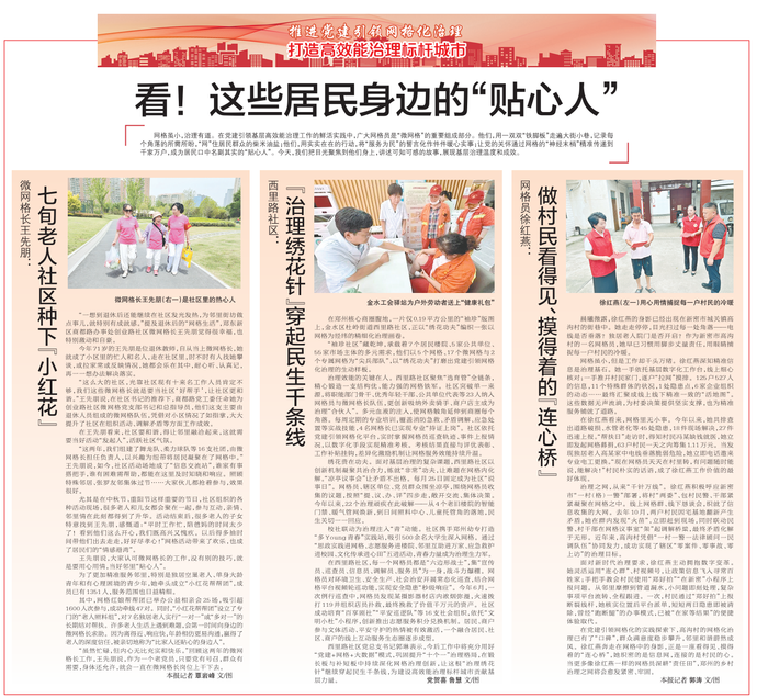 网格虽小,治理有道。在党建引领基层高效能治理工作的鲜活实践中,广大网格员是“微网格”的重要组成部分。他们,用一双双“铁脚板”走遍大街小巷,记录每个角落的所需所盼,“网”住居民群众的柴米油盐;他们,用实实在在的行动,将“服务为民”的誓言化作件件暖心实事;让党的关怀通过网格的“神经末梢”精准传递到千家万户,成为居民口中名副其实的“贴心人”。今天,我们把目光聚焦到他们身上,讲述可知可感的故事,展现基层治理温度和成效。(今日《郑州日报》2版)