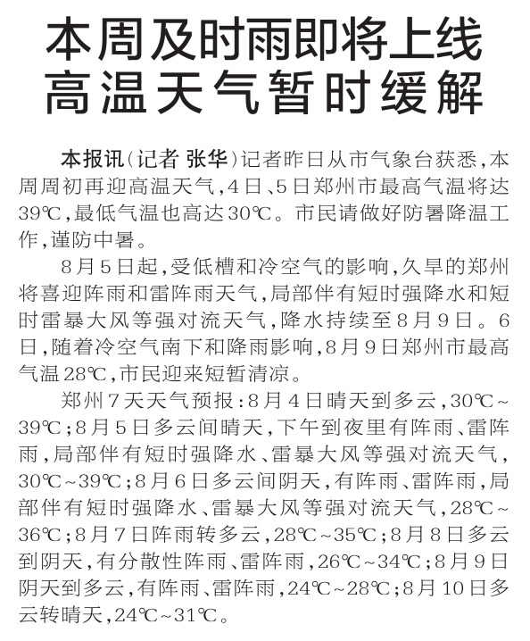 记者昨日从市气象台获悉,本周周初再迎高温天气,4日、5日郑州市最高气温将达39℃,最低气温也高达30℃。市民请做好防暑降温工作,谨防中暑。(今日《郑州日报》1版)
