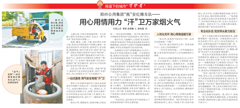 装卸、搬运、上楼、下楼,他们穿行大街小巷,将安全合规的液化气和暖心服务一站送达居民家中;科普宣传、指导用气,安全检查、隐患排查,他们不辞辛苦,坚持“送气必查”,用细心和耐心织密用气安全“防护网”。(今日《郑州日报》2版)