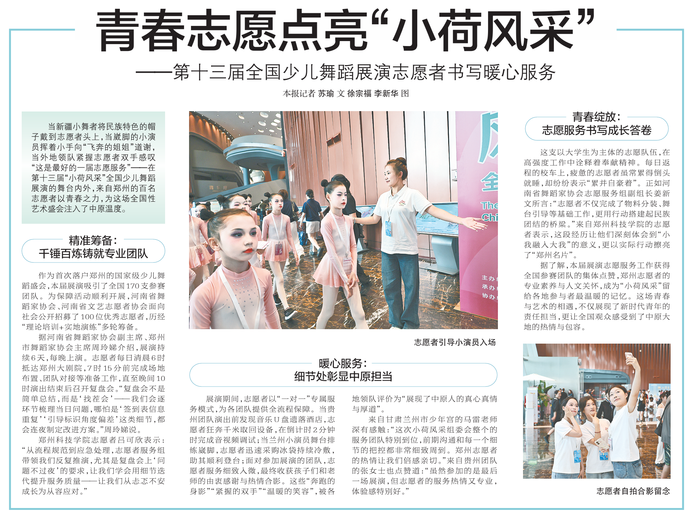 当新疆小舞者将民族特色的帽子戴到志愿者头上,当崴脚的小演员挥着小手向“飞奔的姐姐”道谢,当外地领队紧握志愿者双手感叹“这是最好的一届志愿服务”——在第十三届“小荷风采”全国少儿舞蹈展演的舞台内外,来自郑州的百名志愿者以青春之力,为这场全国性艺术盛会注入了中原温度。(今日《郑州日报》6版)