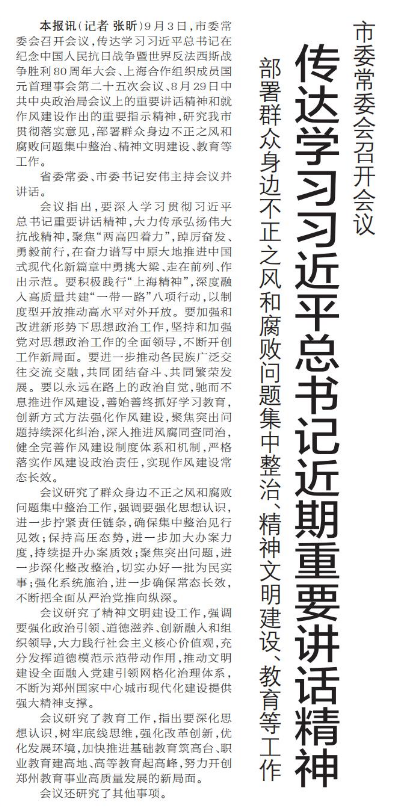 9月3日,市委常委会召开会议,传达学习习近平总书记在纪念中国人民抗日战争暨世界反法西斯战争胜利80周年大会、上海合作组织成员国元首理事会第二十五次会议、8月29日中共中央政治局会议上的重要讲话精神和就作风建设作出的重要指示精神,研究我市贯彻落实意见,部署群众身边不正之风和腐败问题集中整治、精神文明建设、教育等工作。