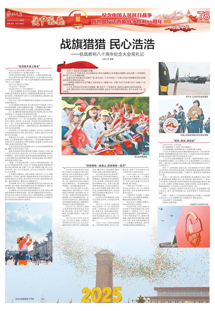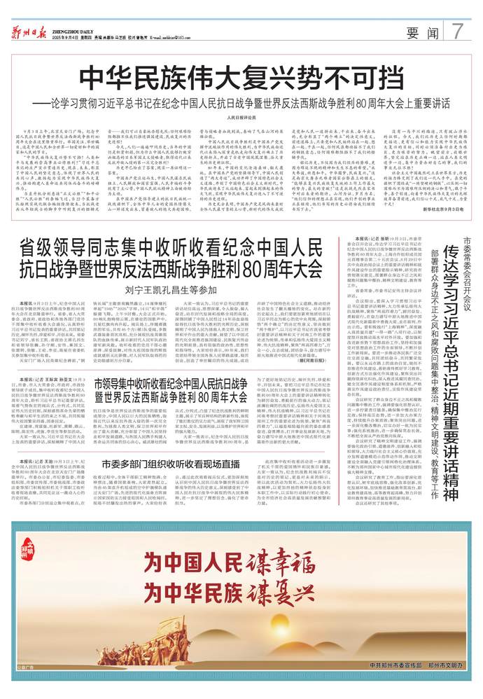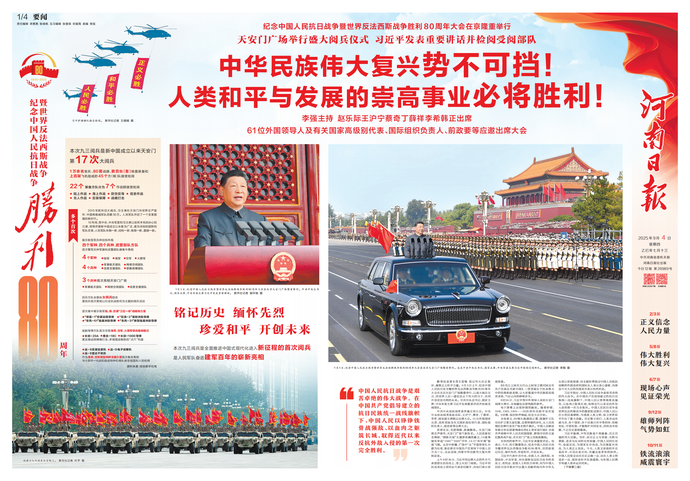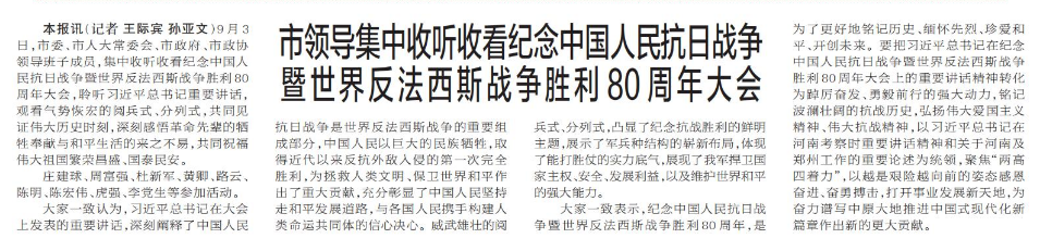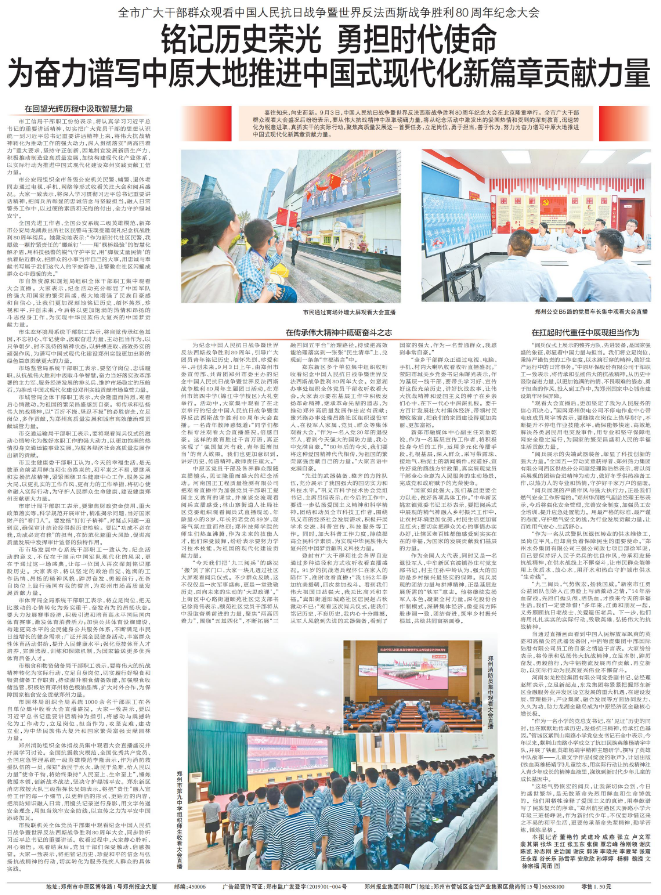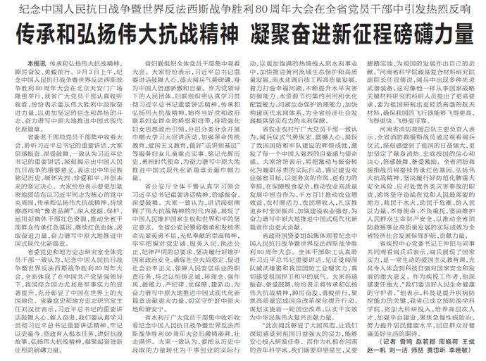 传承和弘扬伟大抗战精神,踔厉奋发、勇毅前行。9月3日上午,纪念中国人民抗日战争暨世界反法西斯战争胜利80周年大会在北京天安门广场隆重举行,我省广大党员干部认真收听收看,纷纷表示要从伟大胜利中汲取奋进力量,以更加坚定的信念和昂扬的斗志,奋力谱写中原大地推进中国式现代化新篇章。(今日《河南日报》5版)