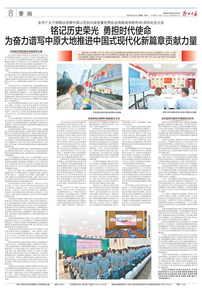 鉴往知来,向史而新。9月3日,中国人民抗日战争暨世界反法西斯战争胜利80周年纪念大会在北京隆重举行。全市广大干部群众观看大会盛况后纷纷表示,要从伟大抗战精神中汲取磅礴力量,将从纪念活动中激发出的爱国热情和受到的深刻教育,迅速转化为锐意进取、真抓实干的实际行动,聚焦高质量发展这一首要任务,立足岗位,勇于担当,善于作为,努力为奋力谱写中原大地推进中国式现代化新篇章贡献力量。(今日《郑州日报》8版)
