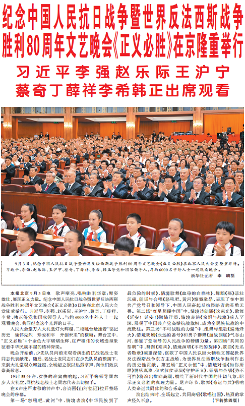 歌声嘹亮,唱响胜利华章;舞姿雄壮,展现正义力量。纪念中国人民抗日战争暨世界反法西斯战争胜利80周年文艺晚会《正义必胜》3日晚在北京人民大会堂隆重举行。习近平、李强、赵乐际、王沪宁、蔡奇、丁薛祥、李希、韩正等党和国家领导人,与约6000名中外人士一起观看晚会,共同纪念这个光辉的日子。(今日《人民日报》2版、4版)