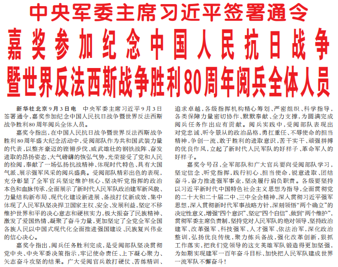 中央军委主席习近平9月3日签署通令,嘉奖参加纪念中国人民抗日战争暨世界反法西斯战争胜利80周年阅兵全体人员。(今日《人民日报》3版)