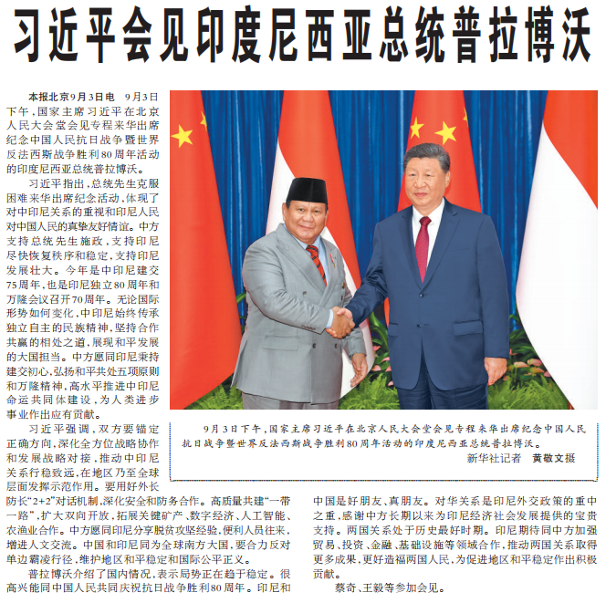 9月3日下午,国家主席习近平在北京人民大会堂会见专程来华出席纪念中国人民抗日战争暨世界反法西斯战争胜利80周年活动的印度尼西亚总统普拉博沃。(今日《人民日报》3版)