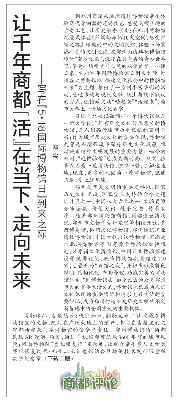 到郑州商城东城垣遗址博物馆亲手体验商代青铜器的范铸技艺,感受陶模生趣的古老工艺,让历史触手可及;在郑州博物馆沉浸式体验《丝绸幻旅》VR大空间,感受丝绸之路上璀璨的中西文明交织,体验一场震撼心灵的文明之旅;在郑州山海砗磲博物馆聆听“潮汐之韵”,沉浸在贝壳展的奇妙世界里,享受一场视觉与心灵的双重盛宴……连日来,在2025年国际博物馆日到来之际,郑州各大博物馆以“快速变化社会中的博物馆未来”为主题,推出了一系列丰富多彩的活动,通过传统与现代交融、线上与线下联动的方式,让馆藏文物“动起来”“活起来”,为市民奉上一场场文化盛宴。(今日《郑州日报》1版、2版)