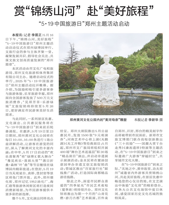 5月16日下午,“锦绣山河,美好旅程”“5·19中国旅游日”郑州主题活动启动仪式在郑州绿博园举行。文旅行业的参与主体齐聚一堂,凝聚发展共识、倡导社会关注、共谋文旅文创高质量发展的“郑州篇章”。(今日《郑州日报》1版)