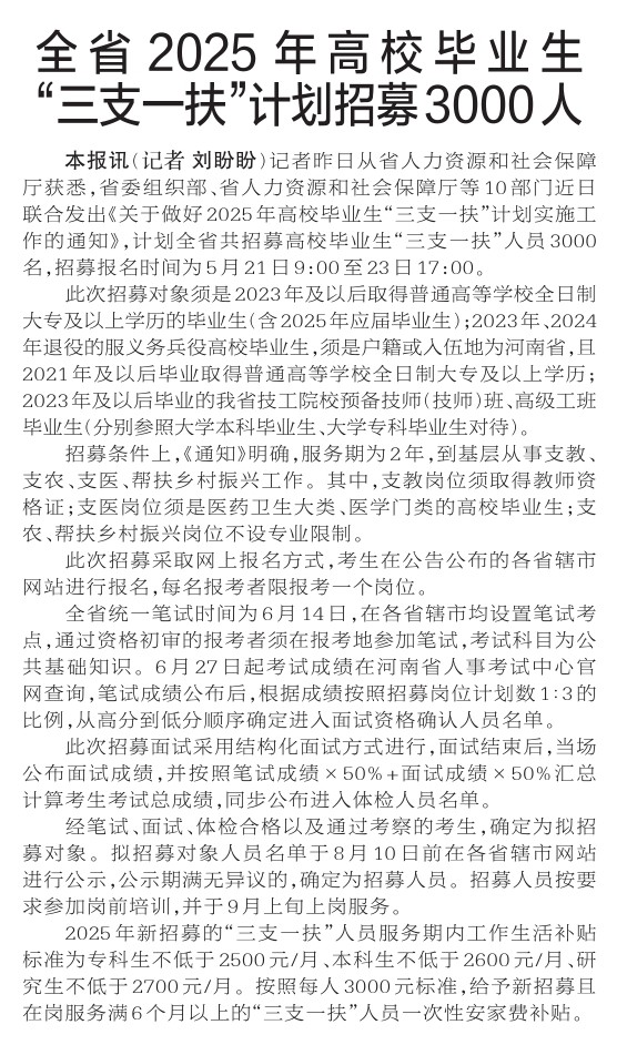 记者昨日从省人力资源和社会保障厅获悉,省委组织部、省人力资源和社会保障厅等10部门近日联合发出《关于做好2025年高校毕业生“三支一扶”计划实施工作的通知》,计划全省共招募高校毕业生“三支一扶”人员3000名,招募报名时间为5月21日9:00至23日17:00。(今日《郑州日报》1版)