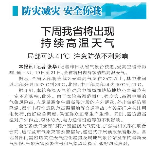 记者昨日从省气象台获悉,受高空暖脊影响,预计5月19日至21日,全省将出现持续晴热高温天气。(今日《郑州日报》1版)