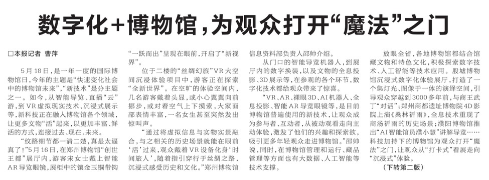 5月18日,是一年一度的国际博物馆日,今年的主题是“快速变化社会中的博物馆未来”,“新技术”是分主题之一。如今,从智能导览、直播“云”游,到VR虚拟现实技术、沉浸式展示等,新科技正在融入博物馆各个领域,让更多文物“活”起来,以更加丰富、鲜活的方式,连接过去、现在、未来。(今日《河南日报》1版、2版)