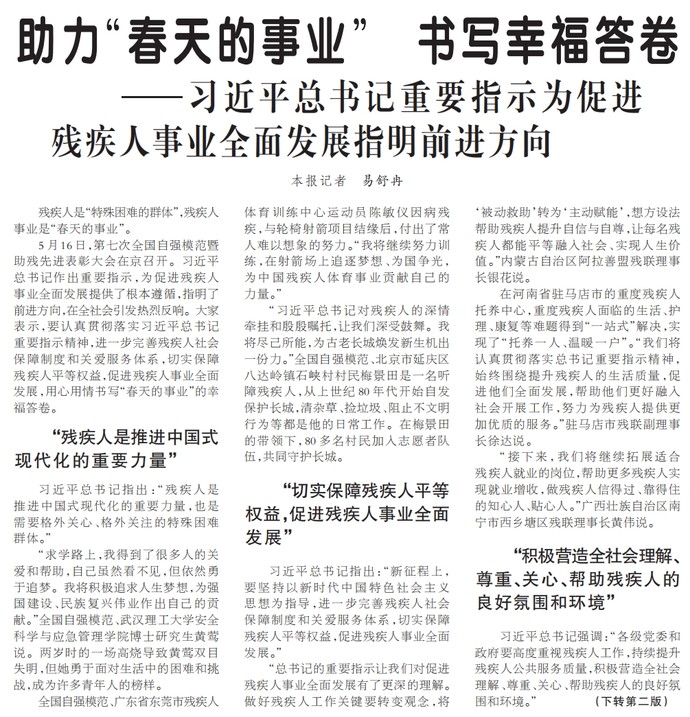 5月16日,第七次全国自强模范暨助残先进表彰大会在京召开。习近平总书记作出重要指示,为促进残疾人事业全面发展提供了根本遵循,指明了前进方向,在全社会引发热烈反响。大家表示,要认真贯彻落实习近平总书记重要指示精神,进一步完善残疾人社会保障制度和关爱服务体系,切实保障残疾人平等权益,促进残疾人事业全面发展,用心用情书写“春天的事业”的幸福答卷。(今日《人民日报》1版、2版)