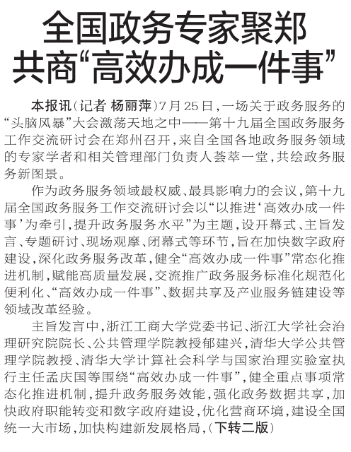 7月25日,一场关于政务服务的“头脑风暴”大会激荡天地之中——第十九届全国政务服务工作交流研讨会在郑州召开,来自全国各地政务服务领域的专家学者和相关管理部门负责人荟萃一堂,共绘政务服务新图景。(今日《郑州日报》1版、2版)