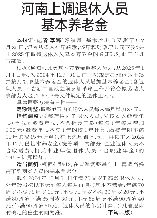 好消息,基本养老金又涨了!7月25日,记者从省人社厅获悉,该厅和财政厅共同下发《关于2025年调整退休人员基本养老金的通知》,对此工作进行部署。(今日《郑州日报》1版、2版)