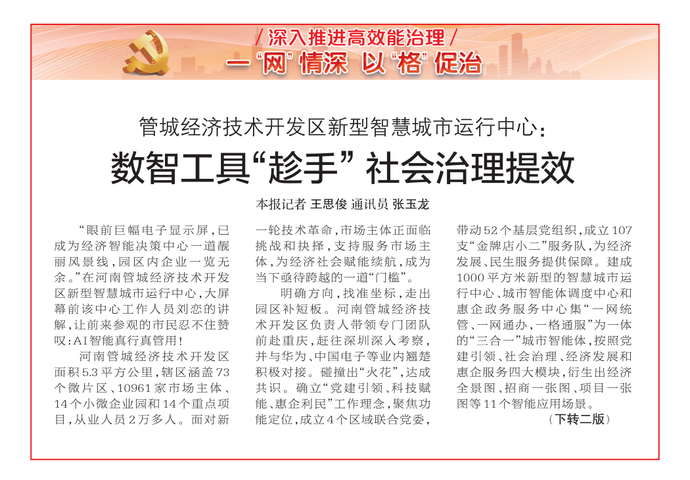 “眼前巨幅电子显示屏,已成为经济智能决策中心一道靓丽风景线,园区内企业一览无余。”在河南管城经济技术开发区新型智慧城市运行中心,大屏幕前该中心工作人员刘恋的讲解,让前来参观的市民忍不住赞叹:AI智能真行真管用!(今日《郑州日报》1版、2版)