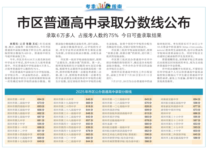 在完成阅卷、核分、划线等一系列程序后,今年市区普通高中录取分数线于昨日公布,最低录取控制分数线为429分。普通高中招生今起开始录取工作。(今日《郑州日报》2版)