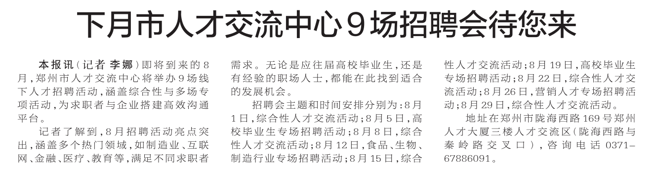即将到来的8月,郑州市人才交流中心将举办9场线下人才招聘活动,涵盖综合性与多场专项活动,为求职者与企业搭建高效沟通平台。(今日《郑州日报》2版)