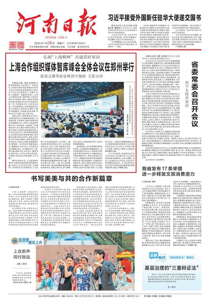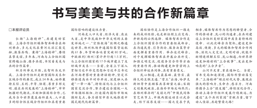 弘扬“上海精神”,共建美好家园。上海合作组织媒体智库峰会在郑州举办,多元文化在黄河之滨汇聚交融,激荡共鸣。秉持“上海精神”、赓续真挚友谊,多年来,河南与上合组织国家跨越山海、携手共进,书写着美美与共的合作篇章。(今日《河南日报》1版)