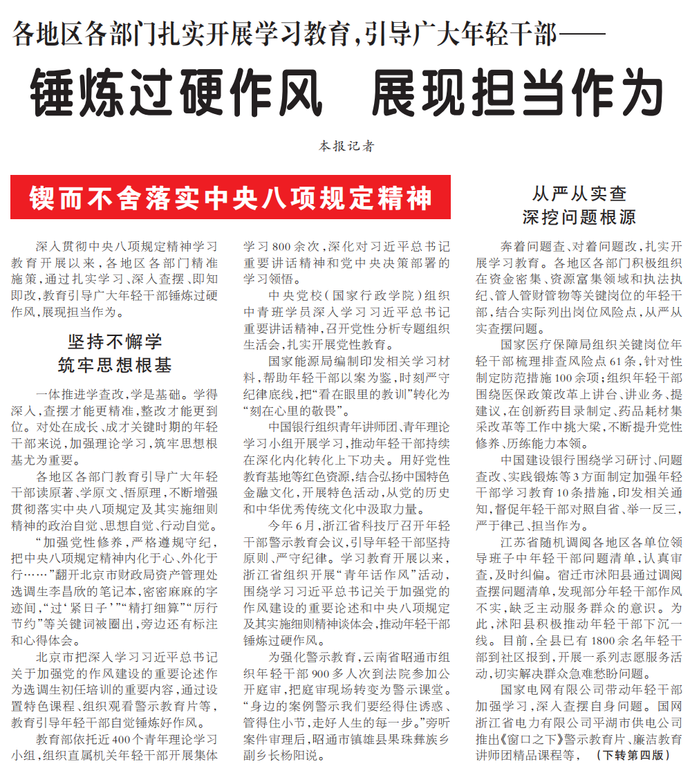 深入贯彻中央八项规定精神学习教育开展以来,各地区各部门精准施策,通过扎实学习、深入查摆、即知即改,教育引导广大年轻干部锤炼过硬作风,展现担当作为。(今日《人民日报》1版、4版)