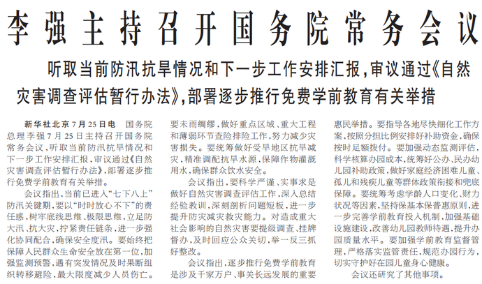 国务院总理李强7月25日主持召开国务院常务会议,听取当前防汛抗旱情况和下一步工作安排汇报,审议通过《自然灾害调查评估暂行办法》,部署逐步推行免费学前教育有关举措。(今日《人民日报》1版)