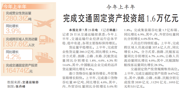 记者25日从交通运输部获悉:今年上半年,交通运输行业经济运行总体平稳、稳中有进,各项主要指标保持增长。(今日《人民日报》1版)
