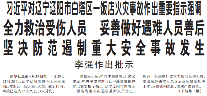 习近平对辽宁辽阳市白塔区一饭店火灾事故作出重要指示强调