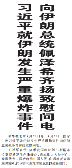 4月29日,国家主席习近平就伊朗发生严重爆炸事件向伊朗总统佩泽希齐扬致慰问电。(今日《人民日报》1版)
