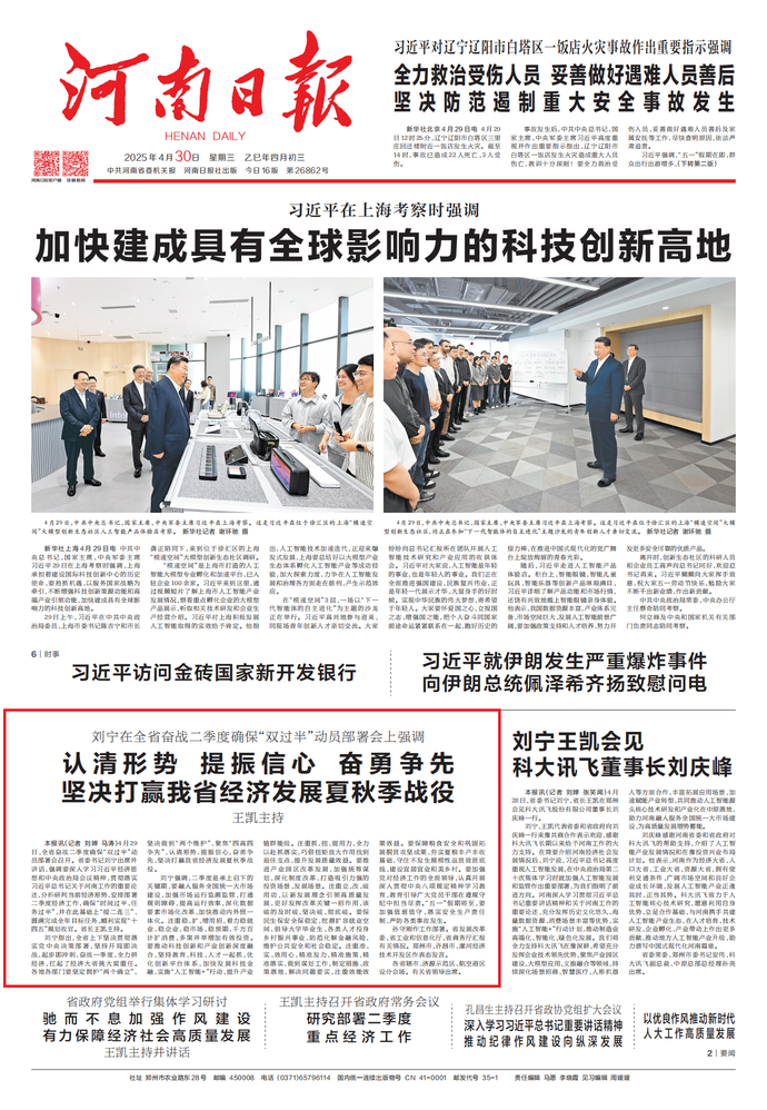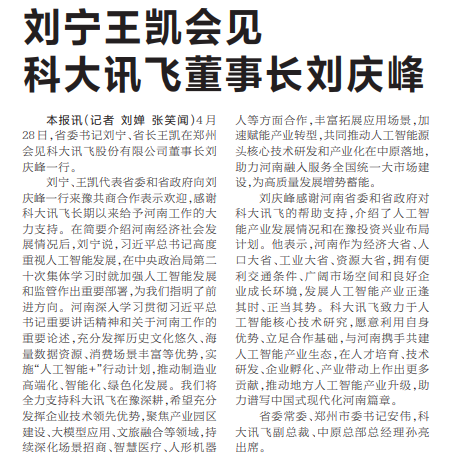 4月28日,省委书记刘宁、省长王凯在郑州会见科大讯飞股份有限公司董事长刘庆峰一行。(今日《河南日报》1版)