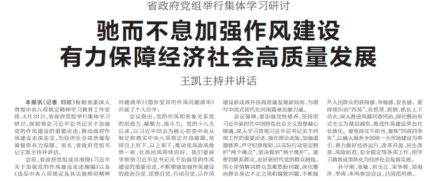 根据省委深入贯彻中央八项规定精神学习教育工作安排,4月29日,省政府党组举行集体学习研讨,深刻领会习近平总书记关于加强党的作风建设的重要论述,推动政府作风建设走深走实,为经济社会高质量发展提供有力保障。省长、省政府党组书记王凯主持并讲话。(今日《河南日报》2版)