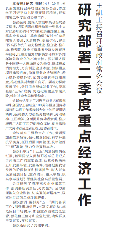 4月29日,省长王凯主持召开省政府常务会议,传达学习习近平总书记重要讲话精神,研究部署二季度重点经济工作。(今日《河南日报》2版)