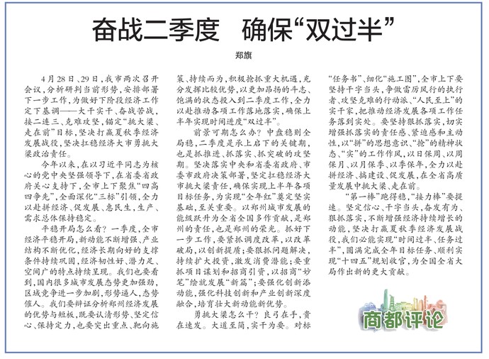 4月28日、29日,我市两次召开会议,分析研判当前形势,安排部署下一步工作,为做好下阶段经济工作定下基调——大干实干、奋战苦战,接二连三、克难攻坚,锚定“挑大梁、走在前”目标,坚决打赢夏秋季经济发展战役,坚决扛稳经济大市勇挑大梁政治责任。(今日《郑州日报》1版)