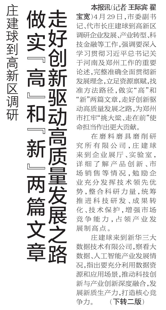 4月29日,市委副书记、代市长庄建球到高新区调研企业发展、产业转型、科技金融等工作,强调要深入学习贯彻习近平总书记关于河南及郑州工作的重要论述,完整准确全面贯彻新发展理念,立足资源禀赋,找准方法路径,做实“高”和“新”两篇文章,走好创新驱动高质量发展之路,为郑州市扛牢“挑大梁、走在前”使命担当作出更大贡献。(今日《郑州日报》1版、2版)