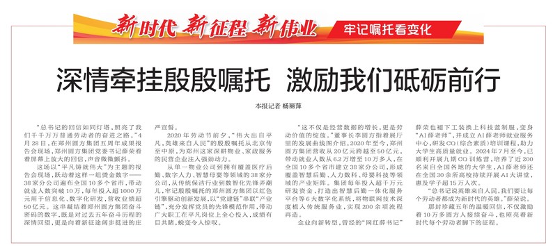 “总书记的回信如同灯塔,照亮了我们千千万万普通劳动者的奋进之路。”4月28日,在郑州圆方集团五周年成果报告会现场,郑州圆方集团党委书记薛荣看着屏幕上放大的回信,声音微微颤抖。(今日《郑州日报》2版)
