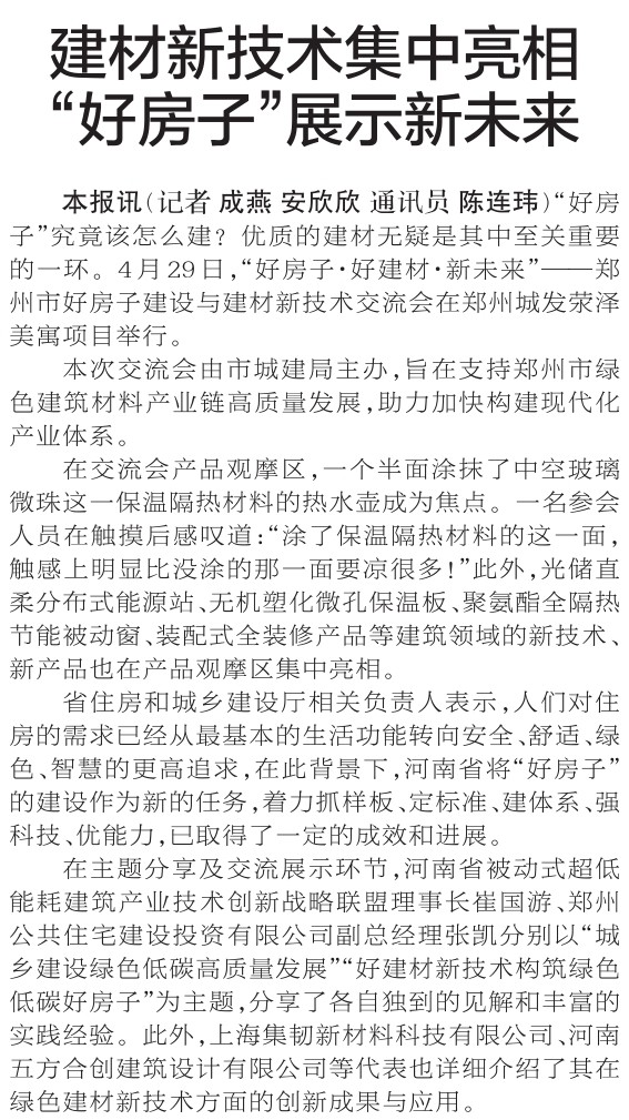 “好房子”究竟该怎么建?优质的建材无疑是其中至关重要的一环。4月29日,“好房子·好建材·新未来”——郑州市好房子建设与建材新技术交流会在郑州城发荥泽美寓项目举行。(今日《郑州日报》2版)
