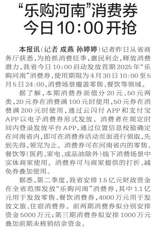 记者昨日从省商务厅获悉,为抢抓消费旺季,惠民利企,释放消费潜力,我省今日10:00启动发放首期2025年“乐购河南”消费券,使用期限为4月30日10:00至5月5日24:00,消费场景覆盖零售、餐饮等领域。(今日《郑州日报》2版)