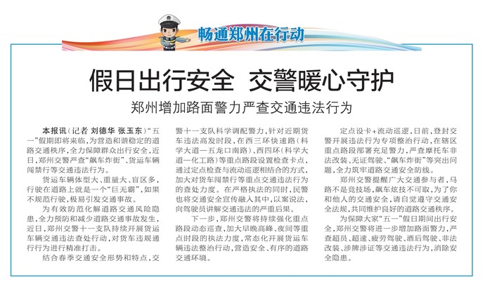 “五一”假期即将来临,为营造和谐稳定的道路交通秩序,全力保障群众出行安全,近日,郑州交警严查“飙车炸街”、货运车辆闯禁行等交通违法行为。(今日《郑州日报》2版)