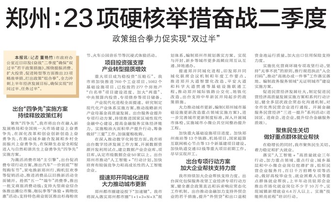 市政府办公室近日印发《奋战“二季度”确保“双过半”若干政策措施》,围绕提振消费、扩大投资、促进转型等方面推出23项精准举措,打出政策“组合拳”,全力冲刺上半年经济发展目标,确保实现“时间过半、任务过半”。(今日《郑州日报》4版)