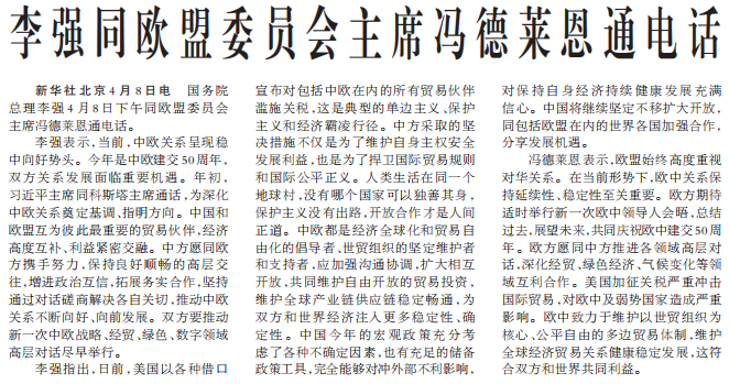 国务院总理李强4月8日下午同欧盟委员会主席冯德莱恩通电话。(今日《人民日报》1版)