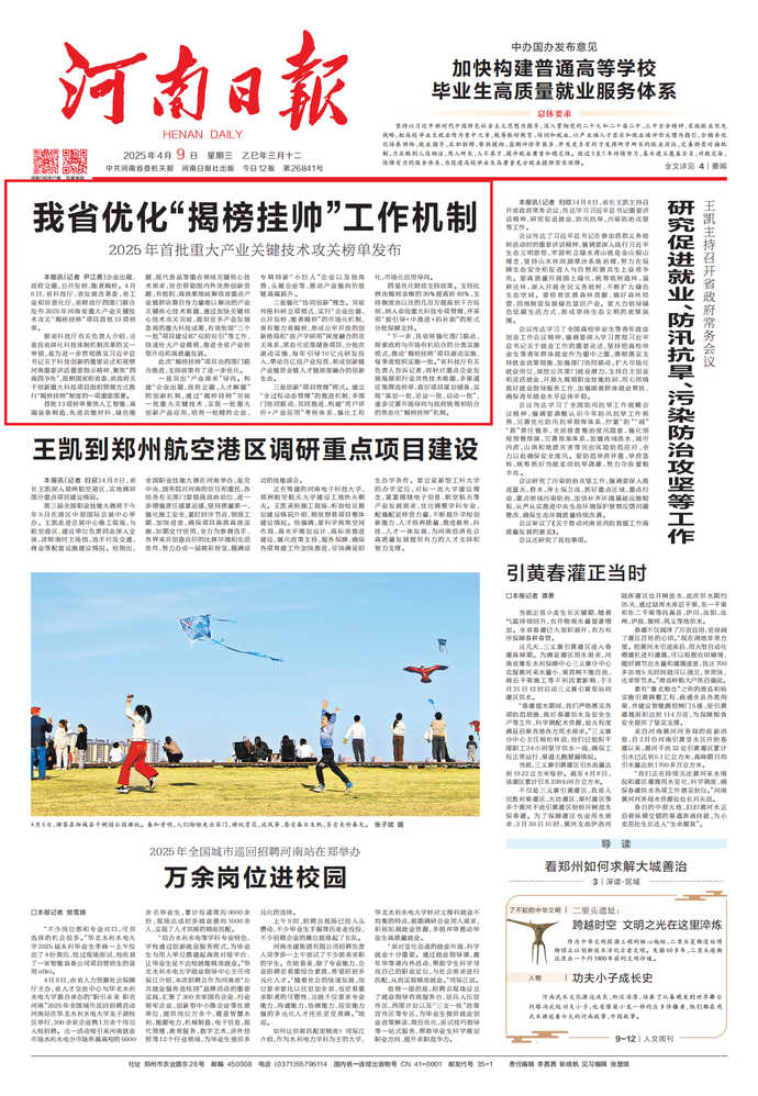 企业出题、政府立题、公开发榜、能者揭榜。4月8日,省科技厅、省发展改革委、省工业和信息化厅、省财政厅四部门联合发布2025年河南省重大产业关键技术攻关“揭榜挂帅”项目首批13项榜单。(今日《河南日报》1版)