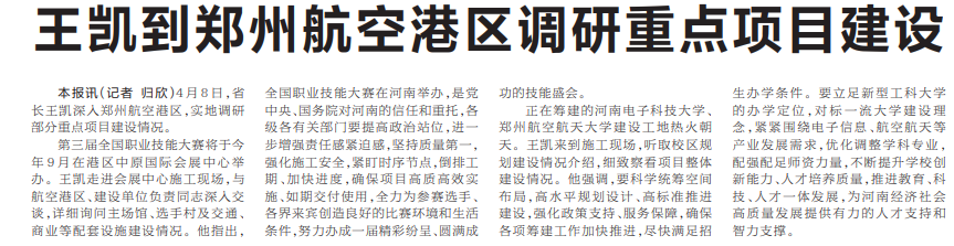 4月8日,省长王凯深入郑州航空港区,实地调研部分重点项目建设情况。(今日《河南日报》1版)