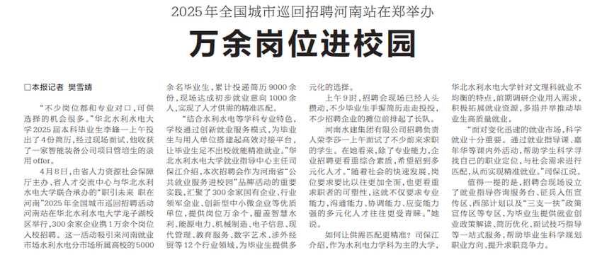 4月8日,由省人力资源社会保障厅主办、省人才交流中心与华北水利水电大学联合承办的“职引未来 职在河南”2025年全国城市巡回招聘活动河南站在华北水利水电大学龙子湖校区举行,300余家企业携1万余个岗位入校招聘。这一活动吸引来河南就业市场水利水电分市场所属高校的5000余名毕业生,累计投递简历9000余份,现场达成初步就业意向1000余人,实现了人才供需的精准匹配。(今日《河南日报》1版)