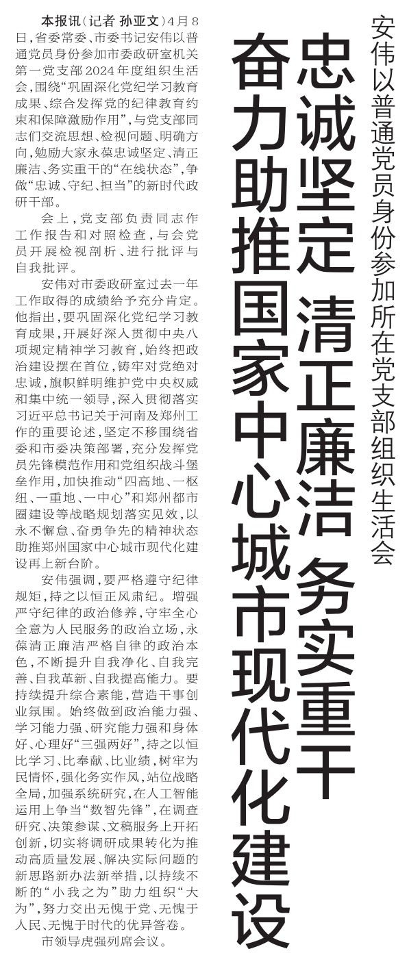 4月8日,省委常委、市委书记安伟以普通党员身份参加市委政研室机关第一党支部2024年度组织生活会,围绕“巩固深化党纪学习教育成果、综合发挥党的纪律教育约束和保障激励作用”,与党支部同志们交流思想、检视问题、明确方向,勉励大家永葆忠诚坚定、清正廉洁、务实重干的“在线状态”,争做“忠诚、守纪、担当”的新时代政研干部。(今日《郑州日报》1版)