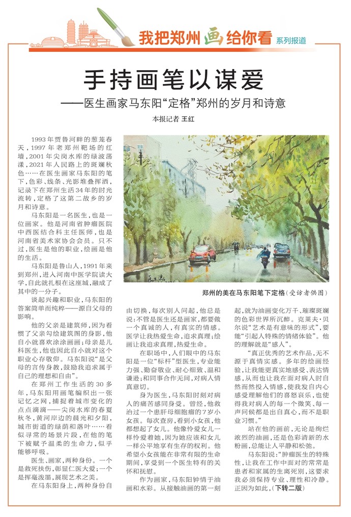 1993年贾鲁河畔的葱茏春天,1997年老郑州靶场的红墙,2001年尖岗水库的绿波荡漾,2021年人民路上的斑斓秋色……在医生画家马东阳的笔下,色彩、线条、光影堆叠挥洒,记录下在郑州生活34年的时光流转,定格了这第二故乡的岁月和诗意。(今日《郑州日报》1版、2版)