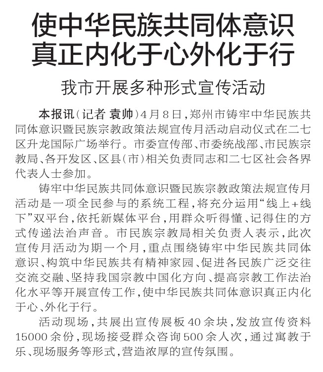4月8日,郑州市铸牢中华民族共同体意识暨民族宗教政策法规宣传月活动启动仪式在二七区升龙国际广场举行。市委宣传部、市委统战部、市民族宗教局、各开发区、区县(市)相关负责同志和二七区社会各界代表人士参加。(今日《郑州日报》2版)